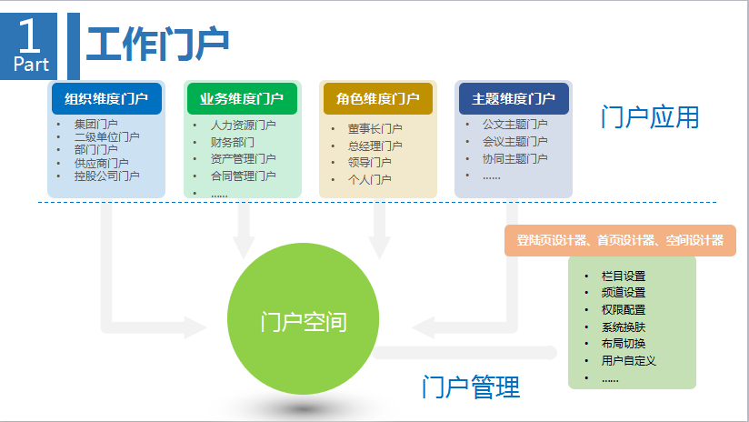 第一環,也是最基本的,企業內部的工作協作。實現組織維度門戶、業務維度門戶的建立,二元化工作流,知識的沉淀與分享,企業文化建設。