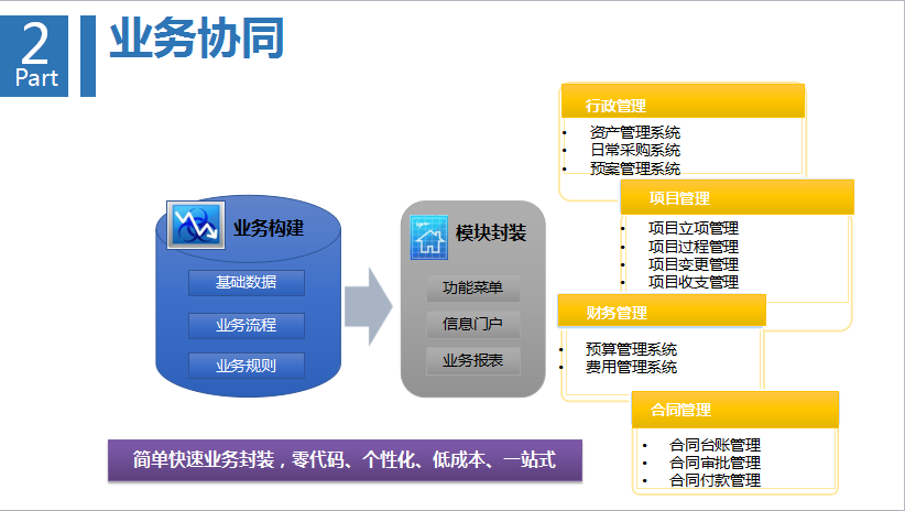 第二環,是業務之間的協同,工作和業務又形成相互的融合。根據企業業務場景,為企業量身定制,覆蓋各個層面與領域。