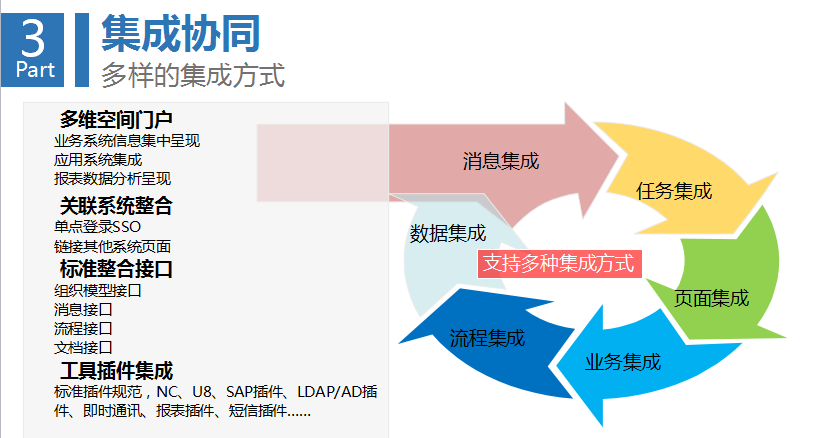 第三環是集成協同。任何企業都在多個系統中間,要思考多個系統之間怎么把數據共享起來?怎么把信息整合起來?怎么產生通用的信息門戶,能達到更高效的信息推送和自動推薦?