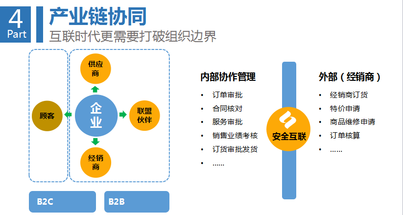第四環是產業鏈協同。企業要在生態中間完成協作,比如說供應鏈、訂單、交易、分享的協作,企業的生態和上下游之間要完成相互協作。