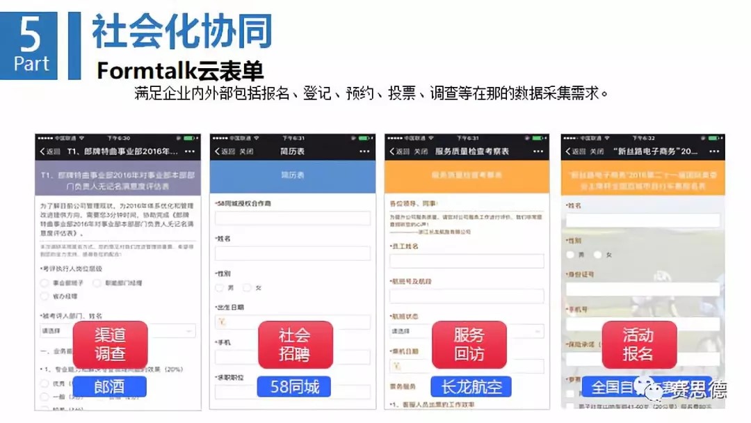 第五環是社會化協同。任何企業都要知道,客戶的第一反應是什么,知道下游供應商的隨動是什么?與其他社交軟件打通,實現移動辦公。